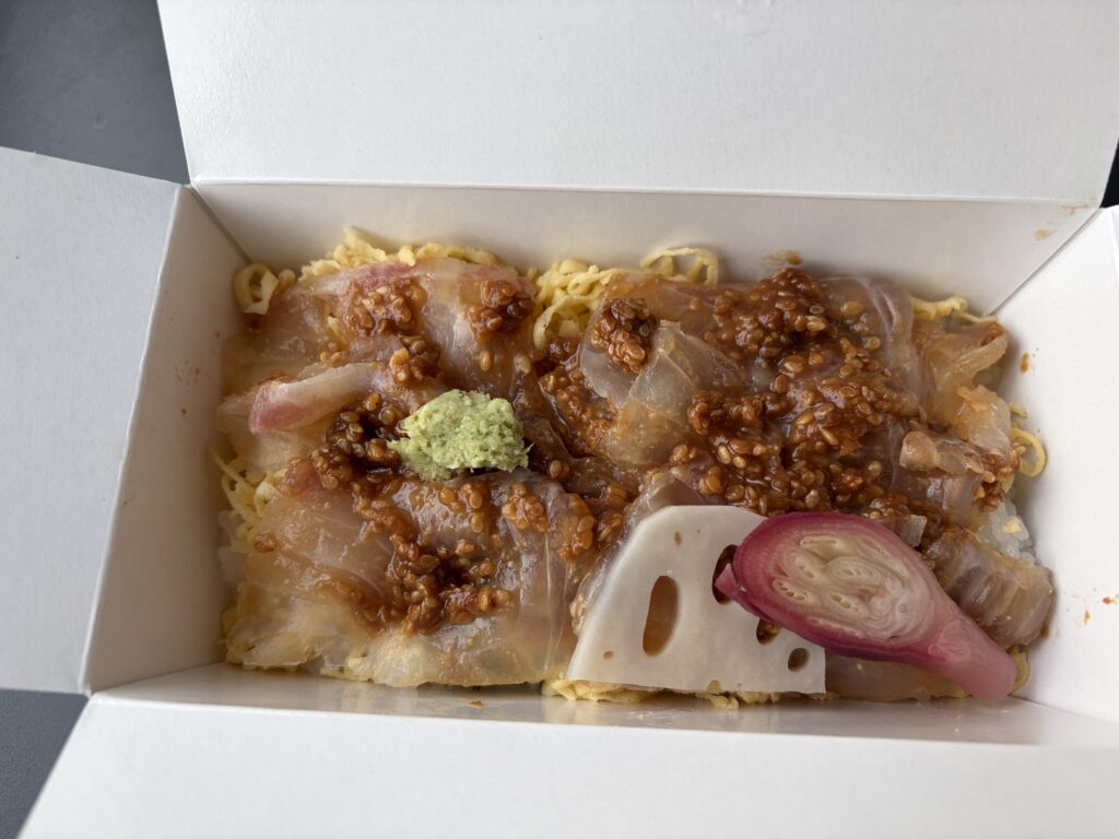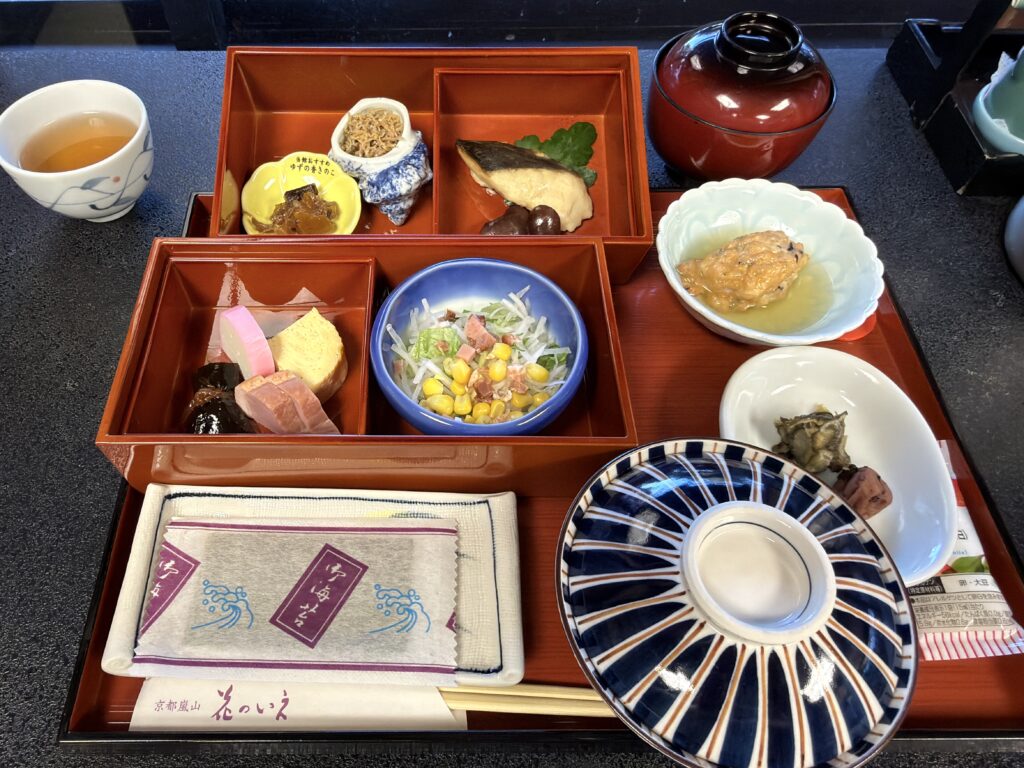 京都駅には早めに到着し、京の名店「はしたて」は鯛の胡麻味噌弁当を受け取り、特急サンダーバードに乗り込みます。