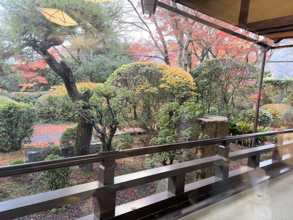 嵐山の宿は、庭に差し込む朝日で紅葉がキラキラと輝いている