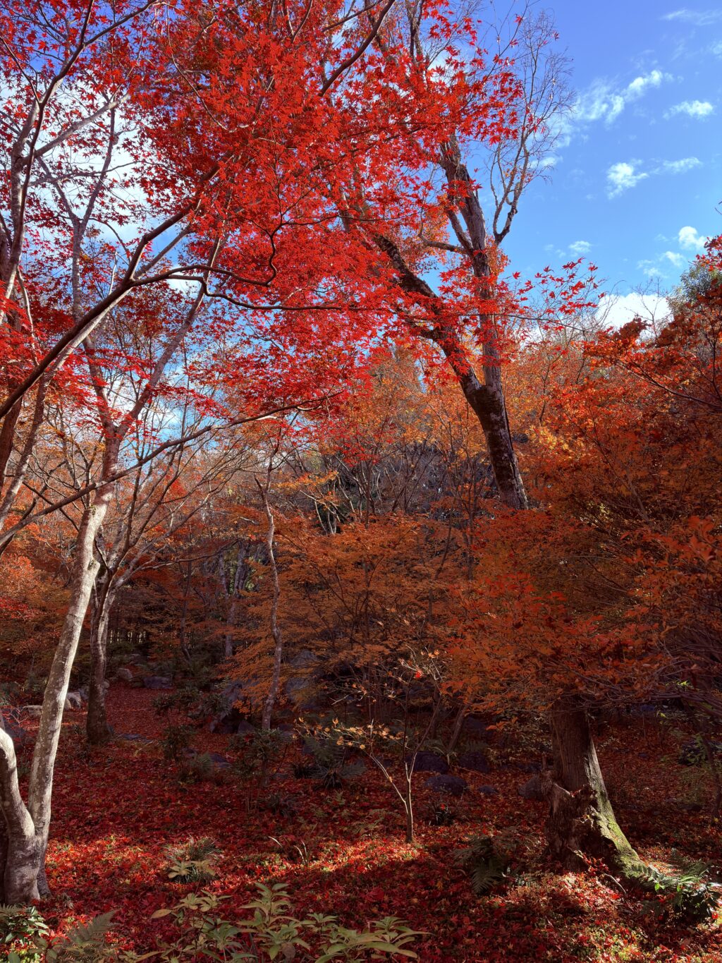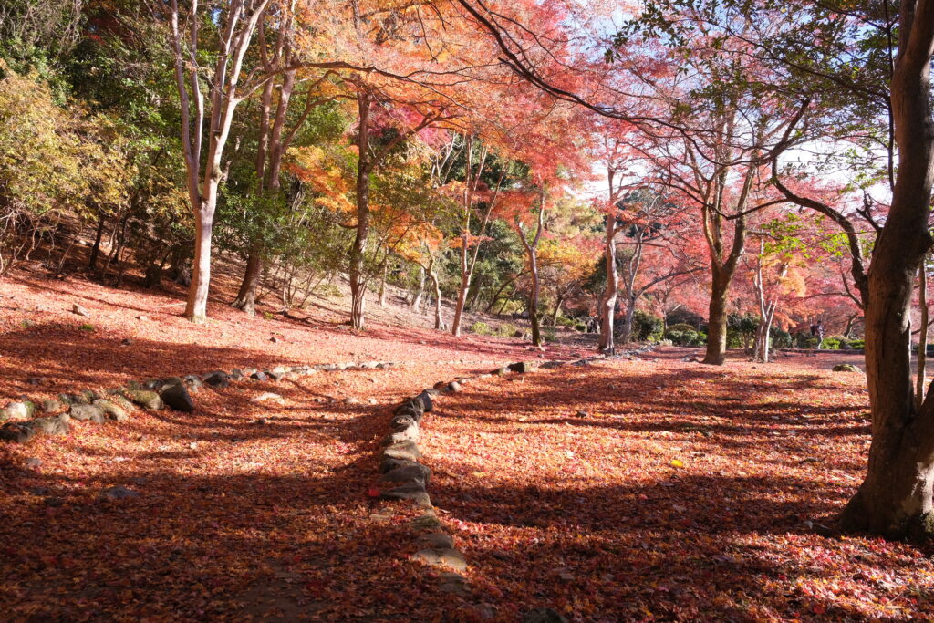 真っ直ぐ続く石畳の左右の紅葉は散っていましたが、真っ赤になったドウダンツツジが目を引きつけます。